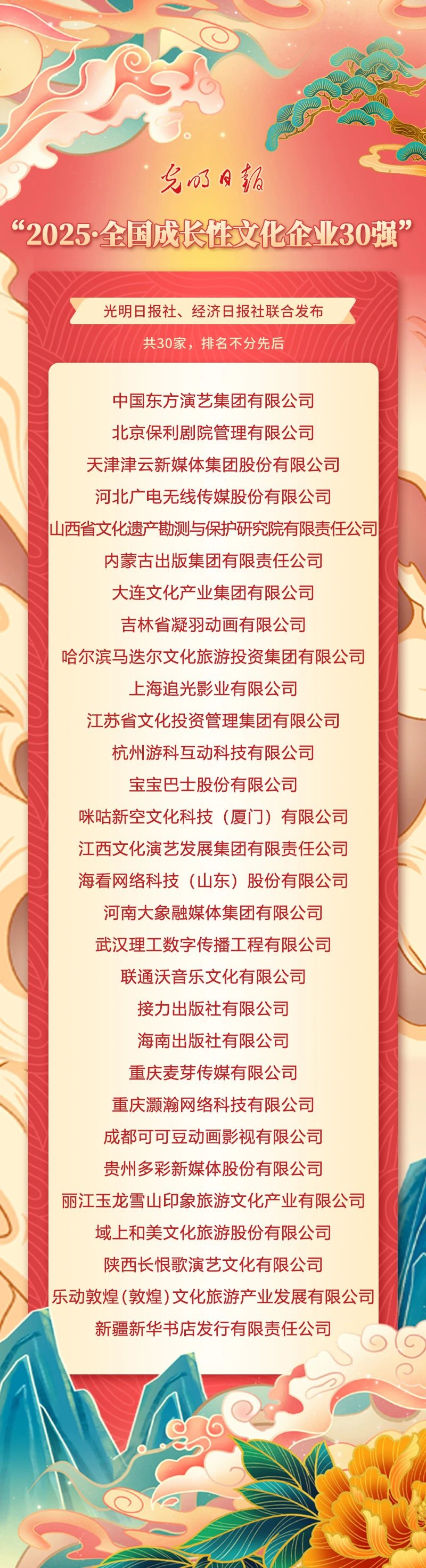5月26日,光明日報社和經(jīng)濟(jì)日報社聯(lián)合向社會發(fā)布“2025·全國文化企業(yè)30強”名單,并發(fā)布“2025·全國成長性文化企業(yè)30強”名單。