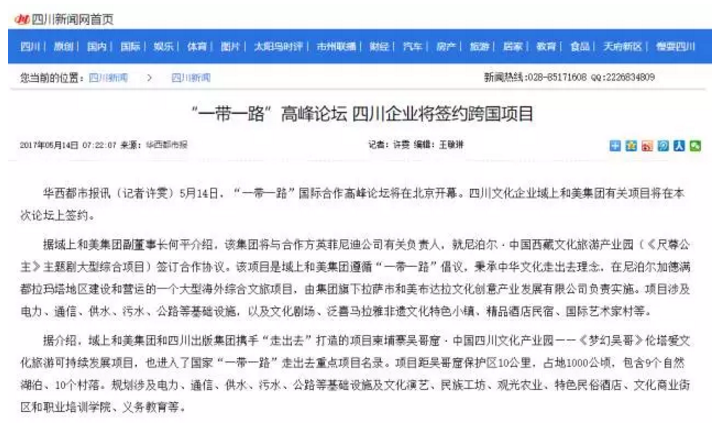 今年5月在京召開的 “一帶一路”國際合作高峰論壇上,域上和美集團(tuán)打造的尼泊爾·中國西藏文化旅游產(chǎn)業(yè)園暨《尺尊公主》歷史舞臺(tái)劇項(xiàng)目成功簽約;而在柬埔寨啟動(dòng)的吳哥窟·中國四川文化產(chǎn)業(yè)園項(xiàng)目,也入選了國家“一帶一路”重點(diǎn)項(xiàng)目庫。