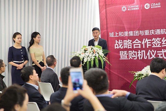 儀式上,域上和美集團總裁何平、重慶通航集團總經(jīng)理龔偉分別代表雙方先后在戰(zhàn)略協(xié)議和購機合同上簽字。其后,域上和美董事長邱偉、重慶通航董事長黃勇分別發(fā)表了講話。邱偉表示:“中國通用航空產(chǎn)業(yè)前景廣闊,中國文化創(chuàng)意及文化旅游產(chǎn)業(yè)方興未艾,雙方皆有巨大發(fā)展?jié)摿?。域上和美集團與重慶通航集團的此次合作,是文創(chuàng)旅游產(chǎn)業(yè)界與通用航空產(chǎn)業(yè)界的一次強強聯(lián)合。我們將充分利用重慶通航集團提供的技術、設備和資源條件,致力于通用航空概念下的文創(chuàng)旅游項目的投資與開發(fā),為文化旅游經(jīng)營探索出一條新路子?!秉S勇董事長表示:“重慶通航集團與域上和美集團的合作,不僅是兩家企業(yè)的合作,也是兩大產(chǎn)業(yè)的合作。意味著文旅產(chǎn)業(yè)和通用航空產(chǎn)業(yè)互為資源平臺,各自拓寬了自己的產(chǎn)業(yè)發(fā)展空間。這種產(chǎn)業(yè)創(chuàng)新必然為雙方創(chuàng)造出互利共贏的局面?!睋?jù)悉,簽訂購機合同,只是雙方具體合作的一部分,目前,域上和美與重慶通航也正在就商業(yè)直升機和商業(yè)固定翼飛機的文旅運用項目展開磋商,探索合作途徑。